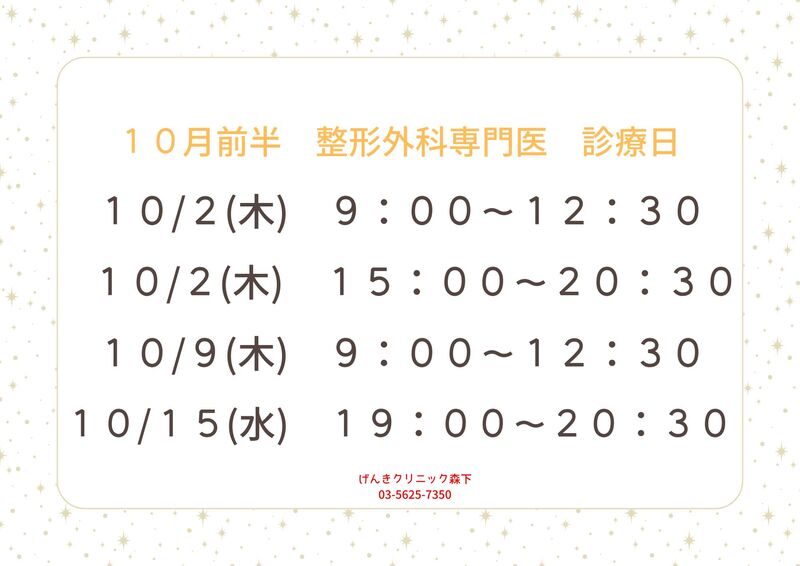 10/2(木)9:00~12:30・15:00~20:30 10/9(木)9:00~12:30 10/15(水)19:00~20:30 になります。 整形外科専門医の日は混み合いますのでご予約をオススメします。 先生方の予定によっては変更になろ場合もありますのでご了承ください。