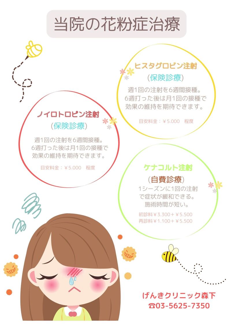 2/1~花粉症治療注射を開始いたします。 ~ケナコルト注射について~ 昨年まで保険適応でしたが、今年より保険適応外となり自費診療での接種となります。 ・ノイロトロピン注射/ヒスタグロビン注射(保険診療・ノンステロイド) ・ケナコルト注射(自費診療・ステロイド) ・内服薬、外用薬処方 ケナコルト注射は同意書が必須になります。 症状やライフスタイルに合わせて最適な治療をご提案させていただきますので、ご希望の方はお気軽にご相談ください。