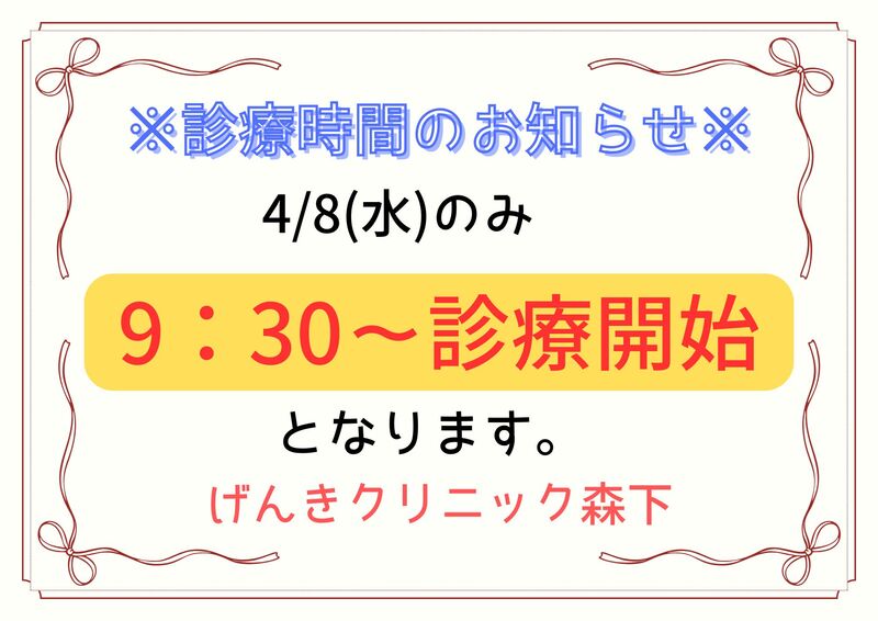4/8(水)のみ診療時間が、9:30~となります。 午前中の受付時間終了は変わらず12:30です。 午後は変わらず15:00~診療開始いたします。 ご迷惑をおかけいたしますが、よろしくお願いいたします。